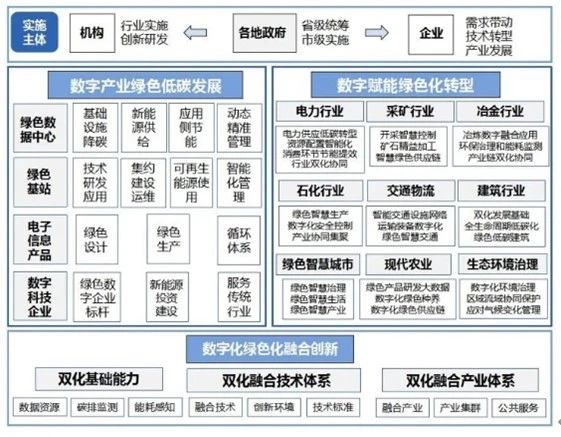 明确双化协同三类实施主体:由各地方政府和相关部门抓统筹落实,由行业协会和高校科研院所等机构推动行业转型和创新研发,由企业作为双化协同转型发展核心主体。指明双化协同两大发力方向:一是要加快数字产业绿色低碳发展,推动数据中心、通信基站、电子信息产品等关键领域的绿色化转型。二是要发挥数字科技企业创新作用,促进电力、采矿、冶金、石化、交通、建筑、城市、农业、生态等九个重点领域的绿色化转型。