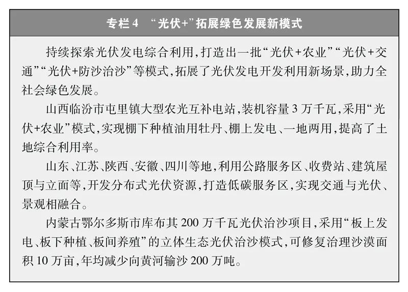 推动风电、光伏发电跃升发展。中国风能、太阳能资源丰富,风电、光伏发电成为清洁能源的主力军。有序推进大型风电光伏基地建设,以库布其、乌兰布和、腾格里、巴丹吉林沙漠为重点,规划建设4.5亿千瓦大型风电光伏基地项目。推进海上风电规模化集群化发展,累计装机规模达3728万千瓦。积极推进分布式新能源发展,开展“千乡万村驭风行动”“千家万户沐光行动”,推广农光互补、渔光互补、牧光互补等“光伏+农业”新模式,打开了农村新能源发展的广阔空间。截至2023年底,中国风电、光伏发电累计装机容量分别达4.41亿千瓦、6.09亿千瓦,合计较10年前增长了10倍。其中,分布式光伏发电累计装机容量超过2.5亿千瓦,占光伏发电总装机容量40%以上。