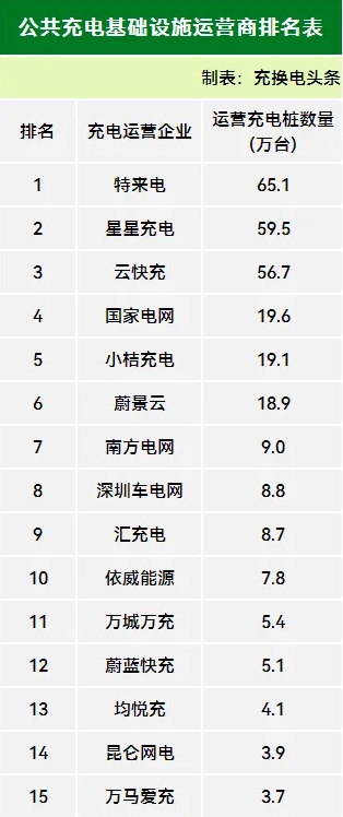 据中国充电联盟统计,截止2024年10月,全国充电运营企业所运营充电桩数量TOP15:特来电、星星充电、云快充、国家电网、小桔充电、蔚景云、南方电网、深圳车电网、汇充电、依威能源、万城万充、蔚蓝快充、均悦充、昆仑网电、万马爱充。这15家运营商占总量的87.1%,其余的运营商占总量的12.9%。