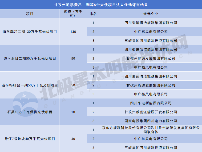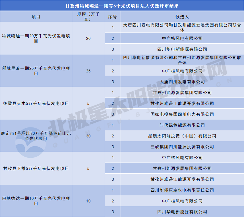 9月22日,四川省甘孜州发改委公示《甘孜州稻城噶通一期等6个光伏项目法人优选评审结果》。