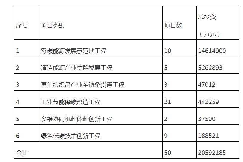 试点建设重点工程项目共50个,总投资为2059亿元。其中,零碳能源发展示范地工程类项目10个,投资额为1461.4亿元;清洁能源产业集群发展工程类项目5个,投资额为526.3亿元;再生纺织品产业全链条贯通工程类项目3个,投资额4.7亿元;工业节能降碳改造工程类项目21个,投资额44.2亿元;多维协同机制体制创新工程类项目2个,投资额为3.8亿元;绿色低碳技术创新工程项目类9个,投资额为18.9亿元。