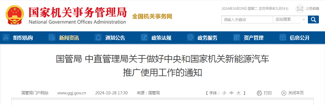 10月28日,国管局、中直管理局联合印发《关于做好中央和国家机关新能源汽车推广使用工作的通知》,旨在支持新能源汽车产业发展,更好发挥中央和国家机关示范引领作用。