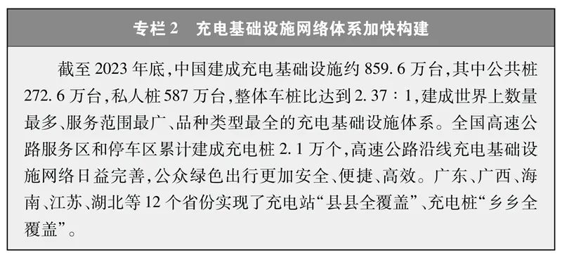 截至2023年底,中国建成充电基础设施约859.6万台,其中公共桩272.6万台,私人桩587万台,整体车桩比达到2.37:1,建成世界上数量最多、服务范围最广、品种类型最全的充电基础设施体系。全国高速公路服务区和停车区累计建成充电桩2.1万个,高速公路沿线充电基础设施网络日益完善,公众绿色出行更加安全、便捷、高效。广东、广西、海南、江苏、湖北等12个省份实现了充电站“县县全覆盖”、充电桩“乡乡全覆盖”。