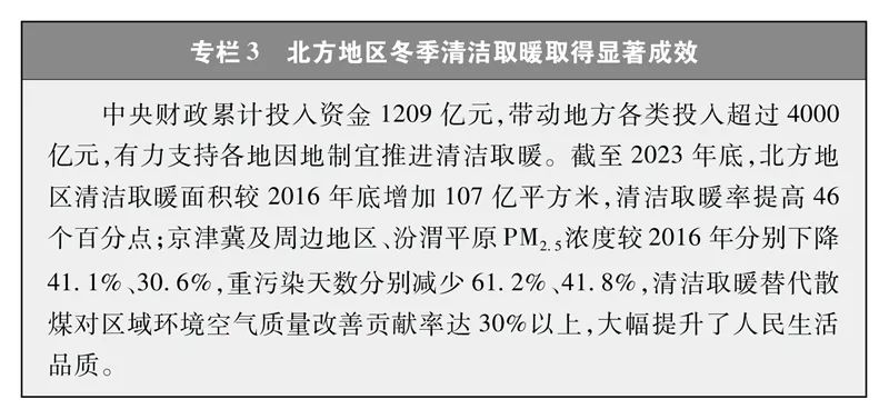 促进终端用能电气化低碳化。工业领域以生产加热、烘干、蒸汽供应等环节为重点,实施高温热泵、电加热等电能替代,推动化工、冶金领域可再生能源制氢示范应用。建筑领域广泛使用太阳能热水器、电炊事等,积极推进北方地区清洁取暖,推动以电力、天然气、生物质、地热、工业余热等清洁低碳能源替代燃煤供暖,2023年北方地区清洁取暖率近80%。交通运输领域大力推广新能源汽车,提升铁路电气化水平,推行船舶、飞机靠港使用岸电。截至2023年底,中国新能源汽车保有量超过2040万辆,全国铁路电气化比例达73.8%。全社会终端用能电气化率达28%,十年来电气化水平提升约7个百分点。