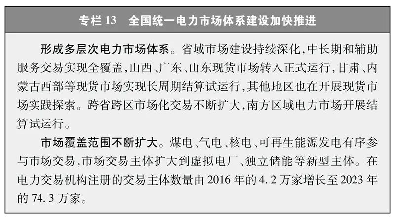 建设全国统一的能源市场。加快建设全国统一电力市场体系,省、区域、省间交易高效协同,中长期、现货、辅助服务交易有机衔接。组建电力交易中心、石油天然气交易中心和煤炭交易中心,搭建公开透明、功能完善的能源交易平台。全国市场化交易电量占全社会用电量比重由2016年的17%提高到2023年的61.4%,2023年风电光伏市场化交易电量占风电光伏总发电量的47%,有力促进了电力资源的优化配置和可再生能源的高效利用。